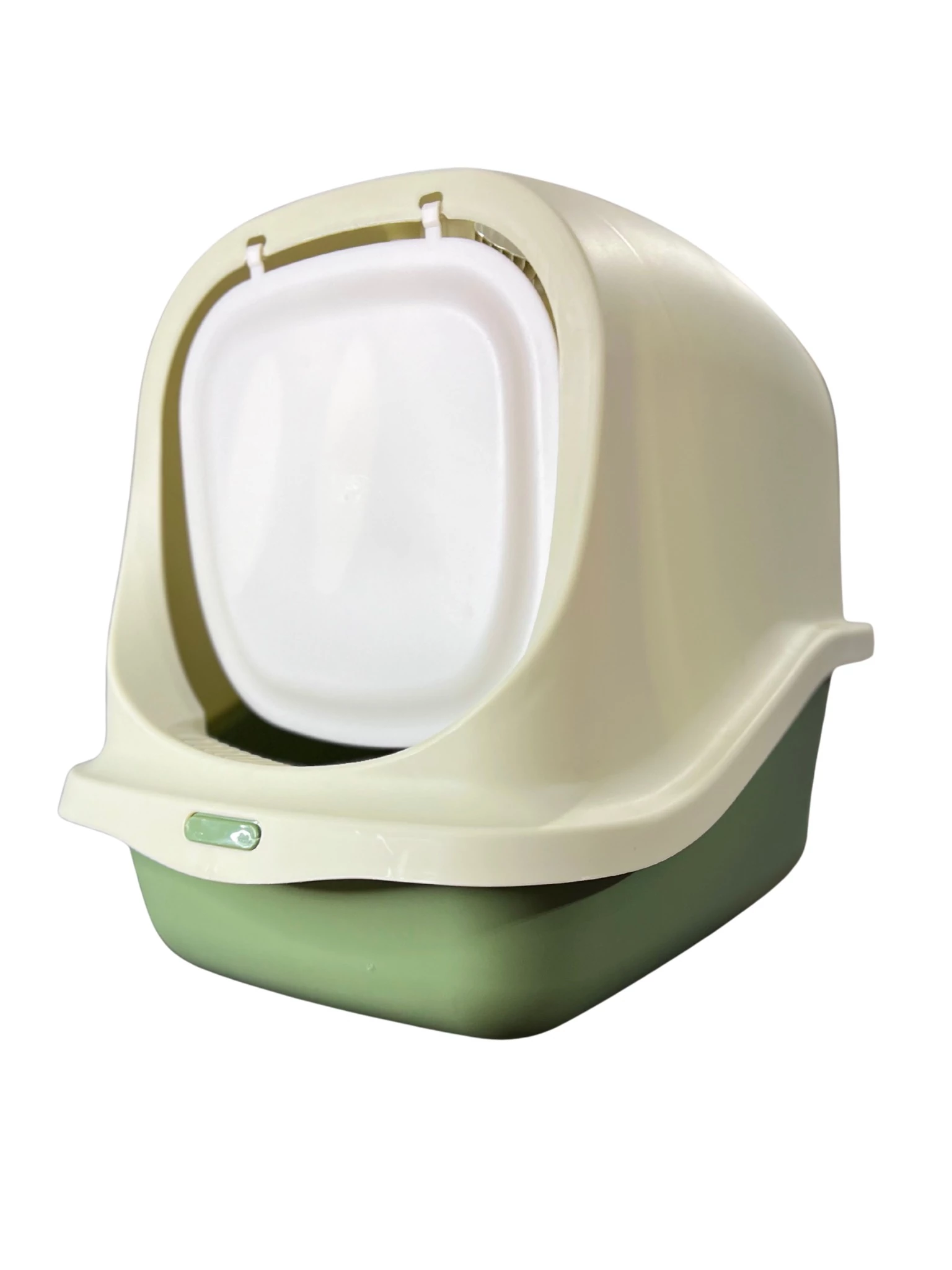 Fedeles macska alomtálca – Zárt kivitel levehető tetővel (Zöld–Fehér)