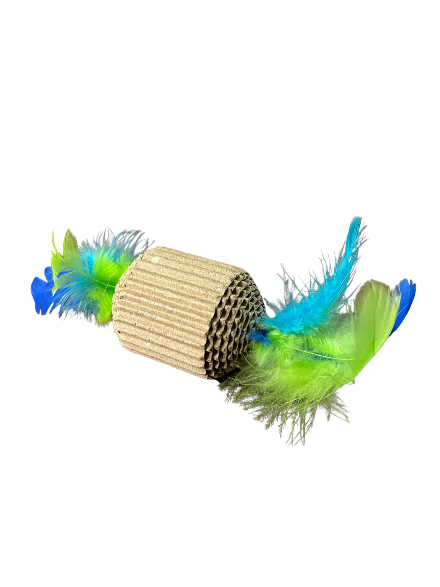 A strapabíró hullámkarton közép rágcsálásra és karmolásra is ideális, a színes tollak pedig folyamatosan mozgásra és játékra csábítanak.