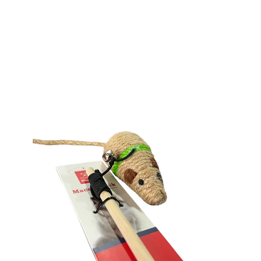 Az egérfej természetes hatású, kötélborítású, ami rágcsálásra és karmolásra is ideális, a hosszú pálca pedig lehetővé teszi, hogy a játék biztonságos távolságból történjen.